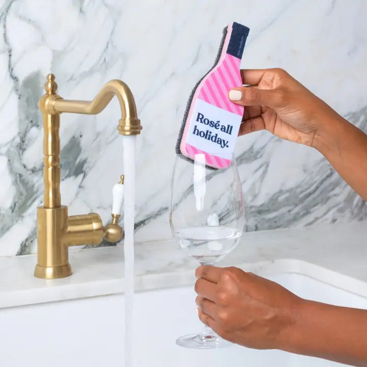 The perfectly pink stocking stuffer for the tidy rosé lover! Fun and functional! Add a *pop* of fun to your kitchen with our "Rosé all Holiday" pink striped cleaning sponge. These wine-shaped sponges are great for light housework. The narrow neck makes it easy to clean inside wine glasses and champagne flutes. Features: