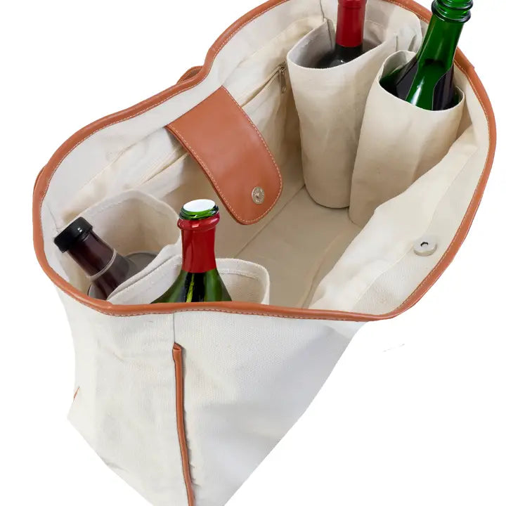 Our bestselling canvas tote is back and better than ever with an added feature. Bottle Compartments! This upgraded design features bottle compartments, making it the perfect companion for picnics, shopping trips, and more. Stylish yet practical, it’s a must-have accessory for anyone on the go and an excellent gift idea for the holiday season or any special occasion. BODY: 100% 16 OZ. Cotton Canvas TRIM & HANDLES: 100% Faux PU Leather